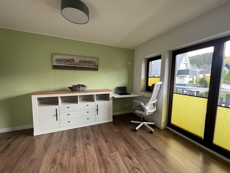Inklusive Schreibtisch, Schuhschrank, Garderobe & Spiegel – auch für Workation geeignet.