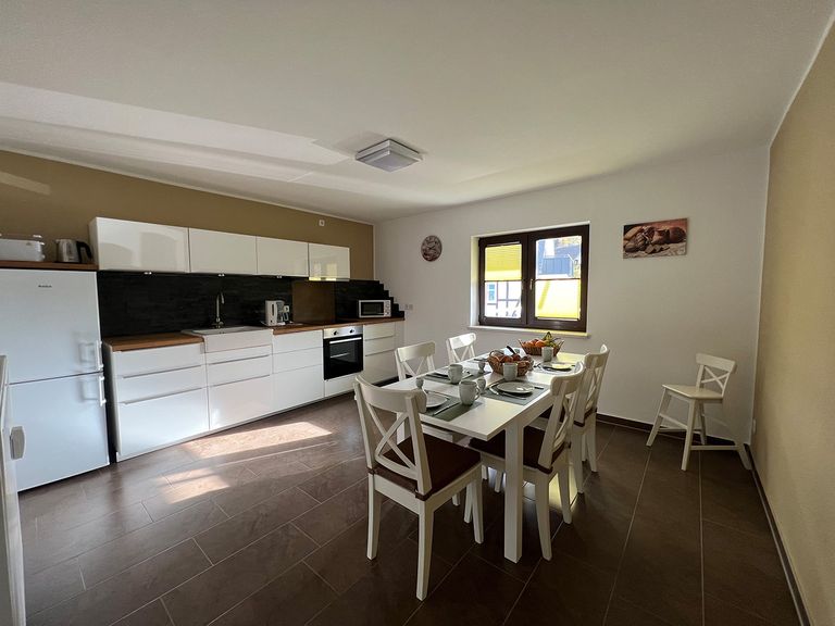 In der voll ausgestatteten Küche finden Sie alles für eine gelungene Selbstverpflegung: Ceran-Kochfeld, Backofen, Geschirrspüler, Kühl-Gefrierkombi, Mikrowelle, Filterkaffeemaschine, Wasserkocher und Toaster. Am Esstisch mit fünf Stühlen und Hochstuhl finden alle Platz – ob beim Frühstück oder beim gemeinsamen Abendessen.