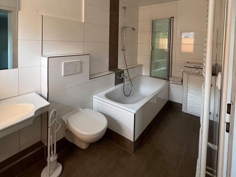 Starten Sie entspannt in den Tag: Ein Badezimmer bietet eine große Badewanne (170x75 cm) mit Duschabtrennung und Handtuchheizkörper, das zweite Bad eine praktische Dusche (80x80 cm) sowie Waschmaschine und Trockner – ideal auch für längere Aufenthalte.
